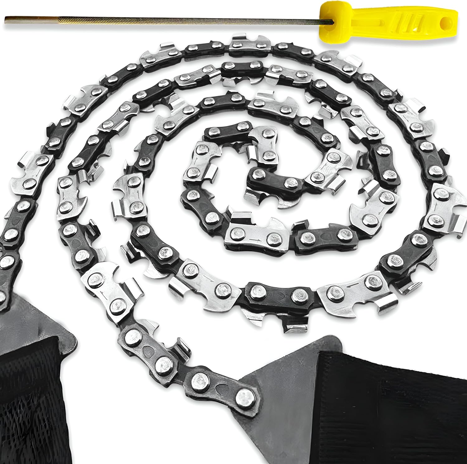 A compact 36-inch pocket chainsaw with 48 sharp teeth, complete with storage box and sharpening file—perfect for camping, hiking, bushcraft, and survival kits.